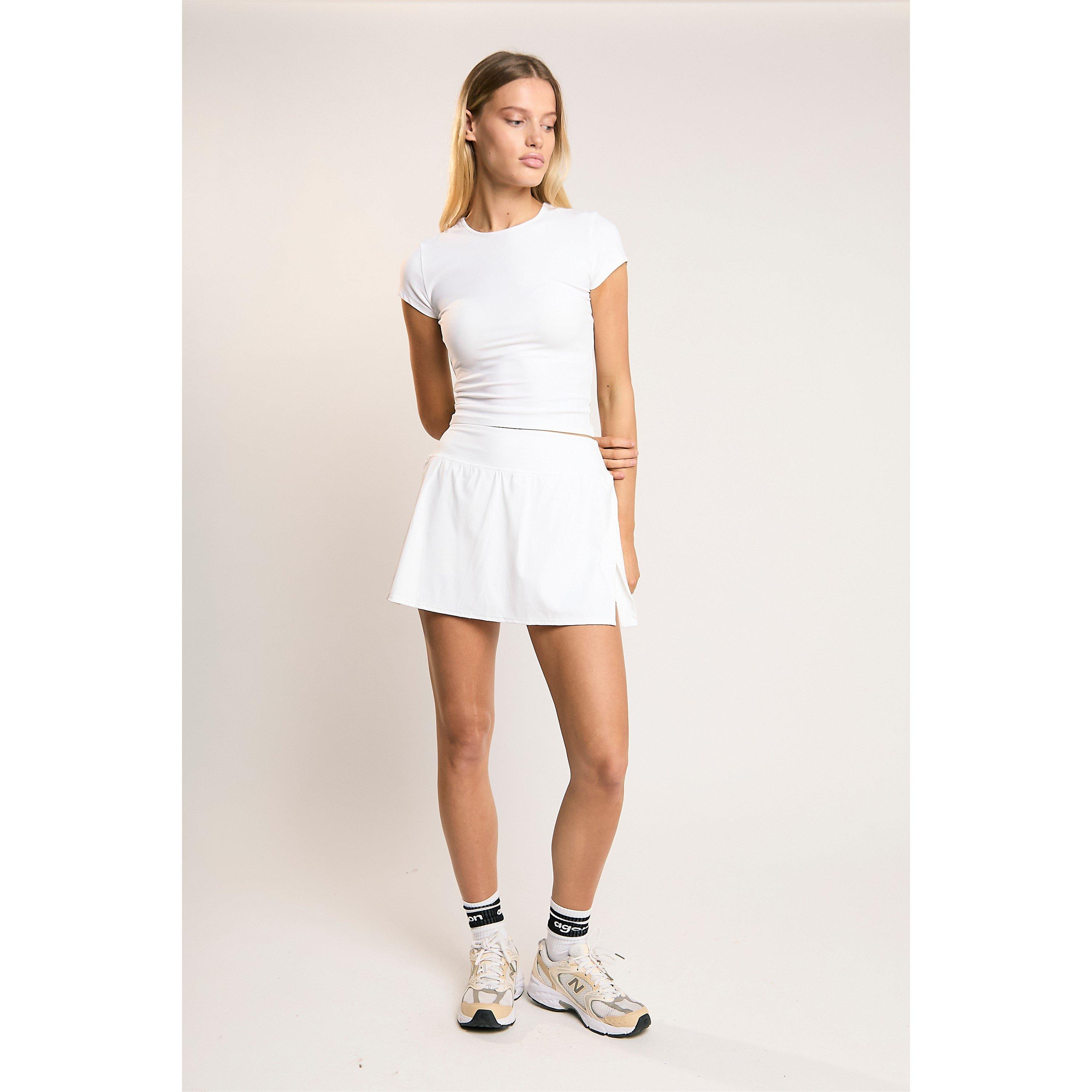 Agon Women's Signature White Scoop-Neck Crop-Top. Stay comfortable and confident with our signature scoop-neck crop-top from the Agon Signature Range. Designed for your busy lifestyle, this top combines a sleek look with practical features to keep you supported throughout the day. The spaghetti straps and scoop neckline create a flattering, minimalist design that feels light and effortless. Crafted from smooth-finish fabric, it offers a soft, breathable feel against your skin while maintaining its shape wear after wear. The built-in invisible bra provides gentle support without the need for extra layers, making it perfect for low-impact activities or casual outings. With seamless construction, this top ensures a smooth fit that moves with you comfortably. Pair it with the matching leggings from our Signature Range for a coordinated outfit that works just as well at the gym as it does for lounging or running errands. This crop-top is an easy-to-style essential that blends functionality with everyday style.