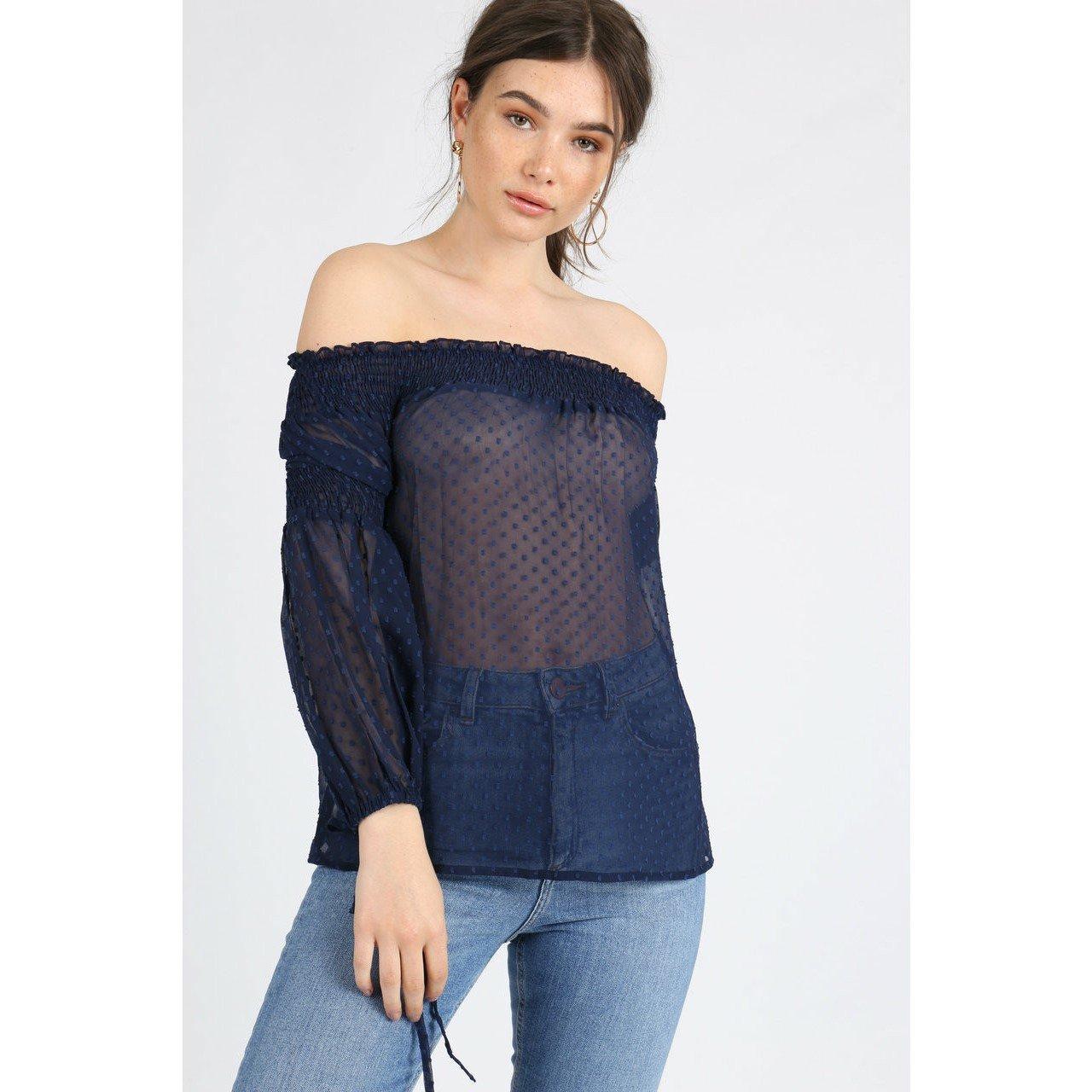 Influences Rynket Bardot Off Shoulder Top har en rynket tekstur. Det off-shoulder design skaber en form, der tilpasser sig din personlige stil.
