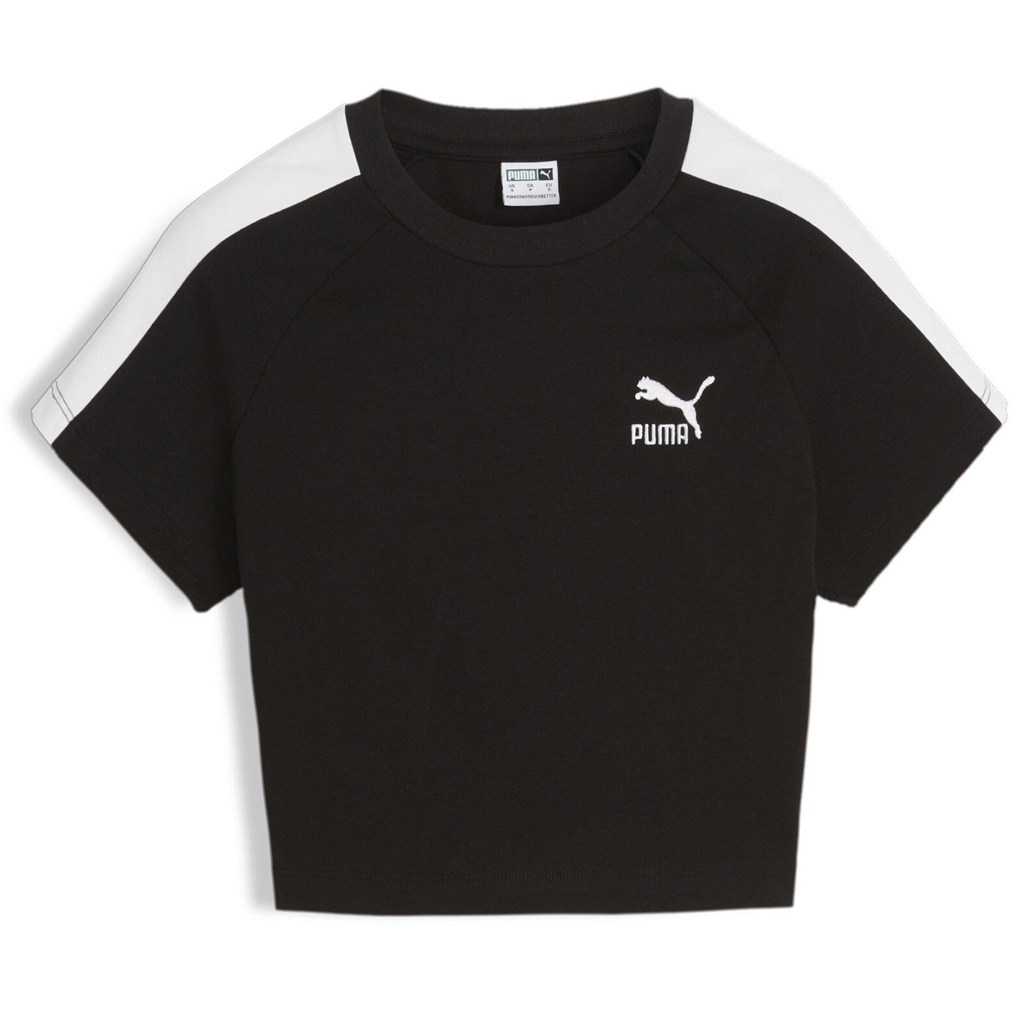 Forbedre din fritidstøjssamling med Pumas ikoniske T7 Baby-tee til kvinder. Komplet med en monokrom profil og sporty linjer op ad armene for ekstra stil. Dette alsidige, afkortede stykke er det ultimative valg til din ugentlige træning eller afslappede ture, når du vil tilføje et sporty touch.