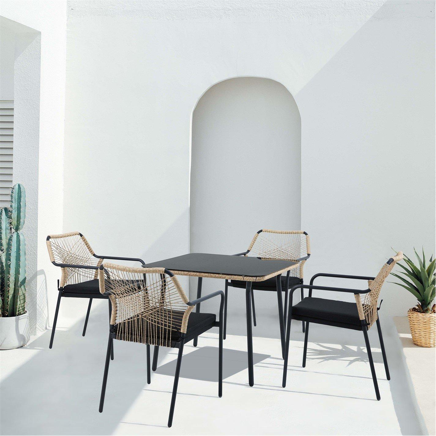 Denne moderne Lisbon 5-delt spisegruppe er en fantastisk måde at opdatere dit udendørs sociale rum på. Sættet leveres med 4 stole og et matchende kvadratisk bord i et stilfuldt sort og reb-design. Ideelt, hvis du vil spise al fresco denne sommer eller bare have ekstra plads til gæster!