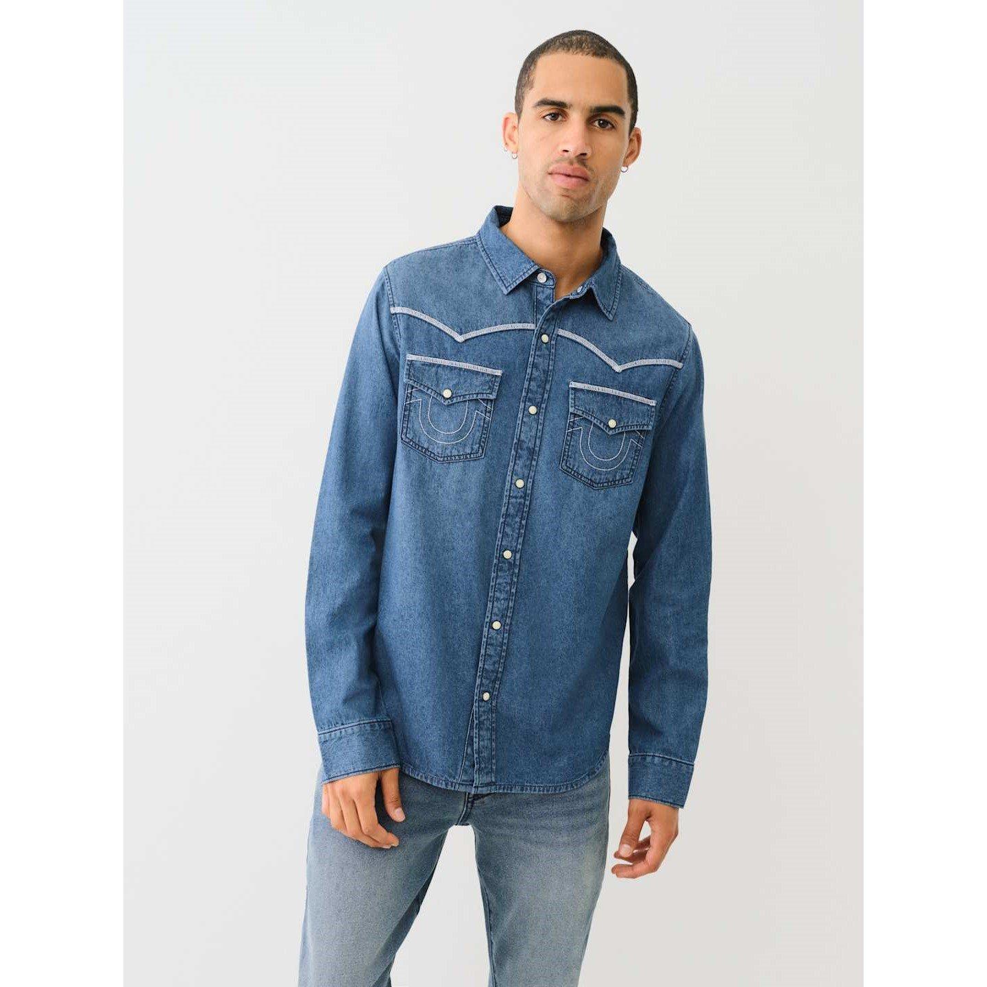 True Religion Træner Chambray Langærmet Denimskjorte er lavet med chambray-stof, der bevarer formen uden at føles stift. Det langærmede design giver fuld dækning med en bærbar, lagbar profil.